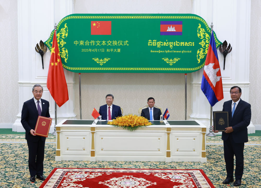 4月17日晚,國(guó)家主席習(xí)近平同柬埔寨首相洪瑪奈在金邊和平大廈舉行會(huì)談。這是會(huì)談后,兩國(guó)領(lǐng)導(dǎo)人共同見證中柬雙方交換雙邊合作文本。新華社記者 王曄 攝