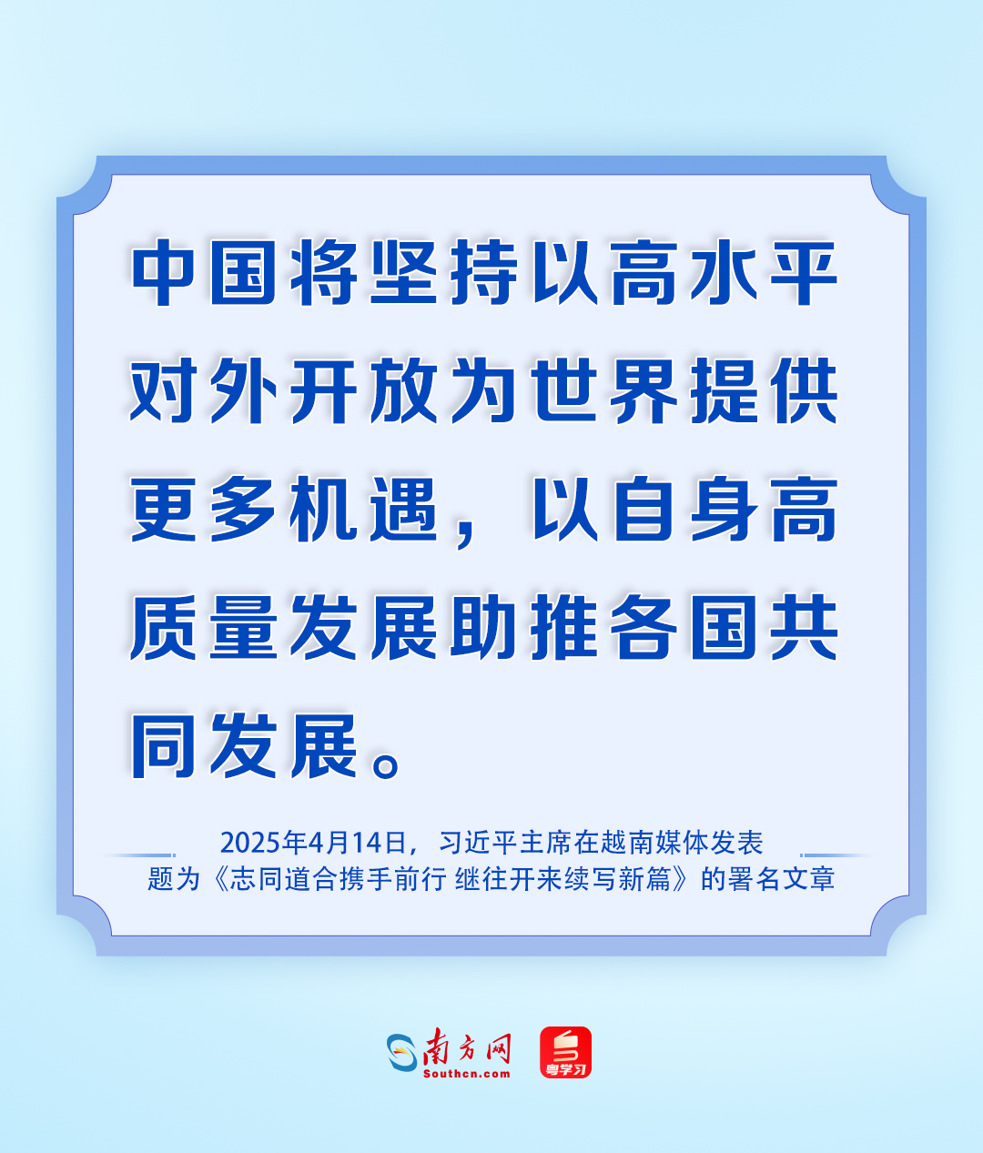 這是一個聯(lián)動周邊、廣交好友的開放舞臺。三大全球倡議和聲部引發(fā)五洲共鳴;倡導經濟全球化,提供共建美好世界的中國方案;“一帶一路”建設,合奏共享共榮的時代交響;點亮“南方力量”,譜寫 “你中有我、我中有你” 的深情合唱。與中國同行就是與機遇同行,這里的合作大門永遠敞開。