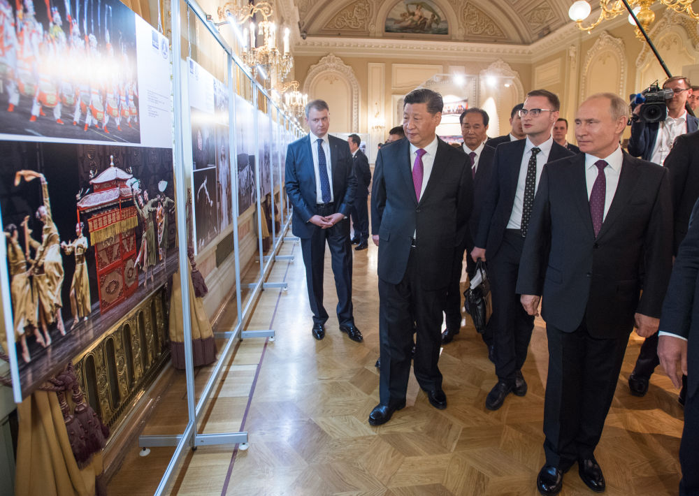 2019年6月5日,國(guó)家主席習(xí)近平和俄羅斯總統(tǒng)普京在莫斯科大劇院共同出席中俄建交70周年紀(jì)念活動(dòng)。這是兩國(guó)元首共同參觀中俄建交70周年圖片展。