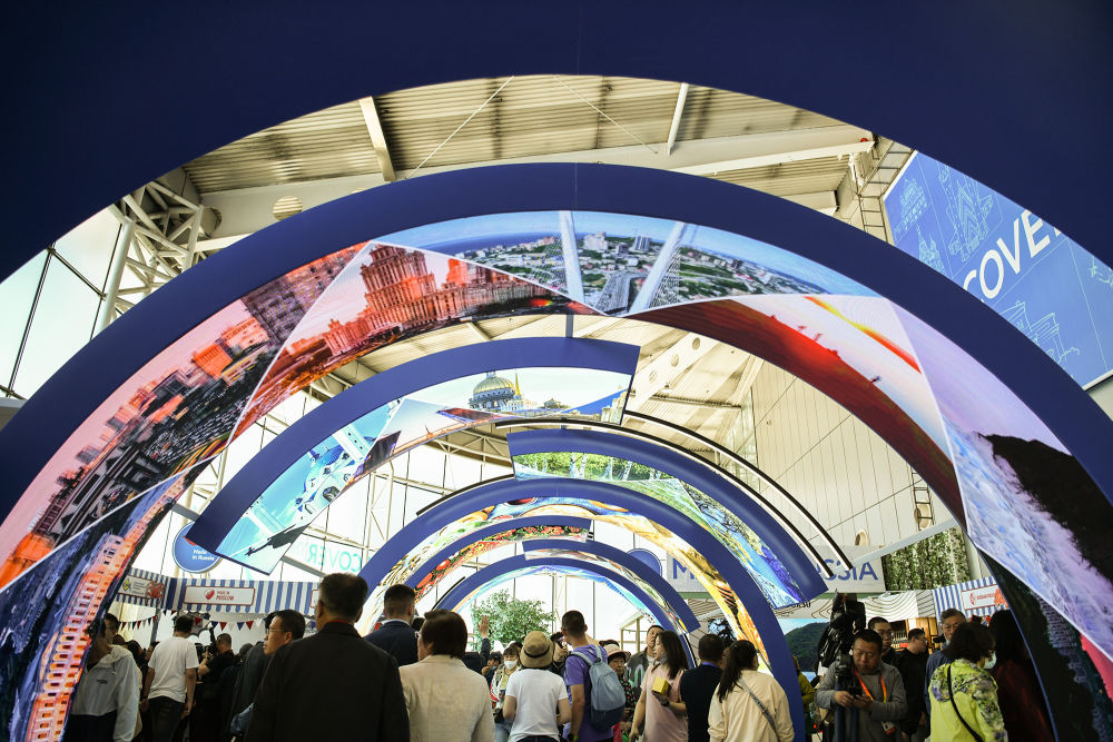 2024年5月18日,人們走進(jìn)在哈爾濱國(guó)際會(huì)展中心舉行的第八屆中俄博覽會(huì)展館。