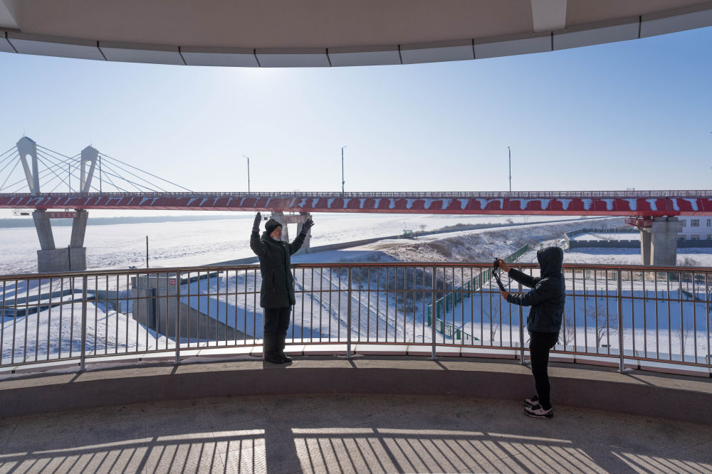 2024年1月30日,游客在黑龍江省黑河市黑龍江大橋公園內(nèi)的觀光塔上留影。黑河—布拉戈維申斯克黑龍江大橋于2022年6月10日正式通車(chē),是中俄首座跨黑龍江(俄羅斯稱(chēng)阿穆?tīng)柡樱┙绾庸窐?,在中?guó)東北地區(qū)和俄羅斯遠(yuǎn)東地區(qū)之間開(kāi)辟了新的國(guó)際運(yùn)輸通道。
