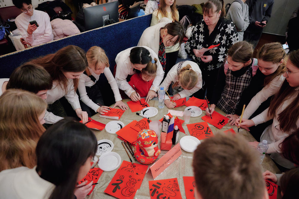 2025年2月3日,俄羅斯圣彼得堡學(xué)生在中小學(xué)春節(jié)聯(lián)歡節(jié)上體驗(yàn)中國(guó)書(shū)法。