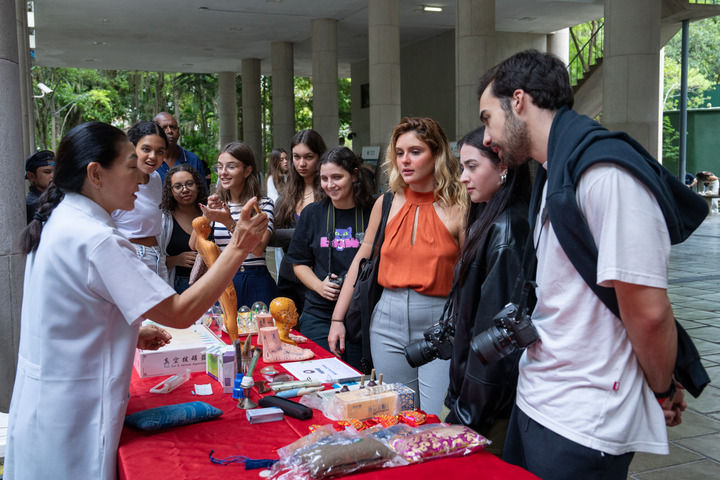 2025年4月15日,在巴西里約熱內(nèi)盧天主教大學(xué)舉辦的“國際中文日”慶祝活動上,學(xué)生們觀看中醫(yī)療法展示。