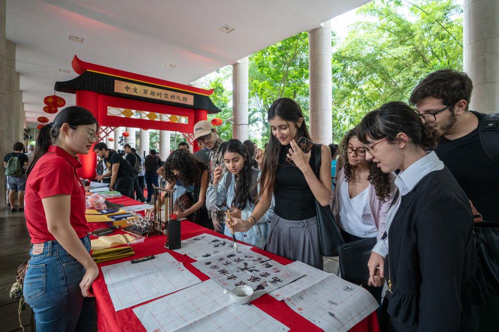 2025年4月,在巴西里約熱內(nèi)盧天主教大學(xué)舉辦的“國際中文日”慶祝活動上,學(xué)生們體驗中文書法。