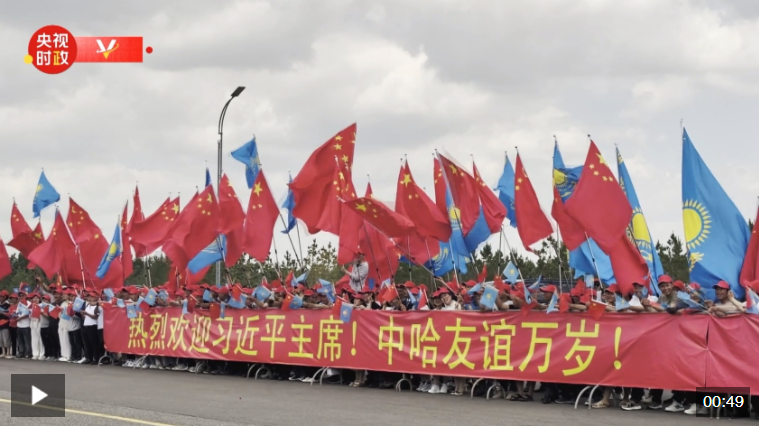 當?shù)貢r間6月16日中午,習(xí)近平主席乘車從機場赴下榻飯店途中,中資企業(yè)和留學(xué)生代表聚集在道路兩旁,手持“熱烈歡迎習(xí)近平主席!”“中哈友誼萬歲!”等紅色橫幅。哈方直升機沿途護衛(wèi),熱烈歡迎習(xí)近平主席到訪。