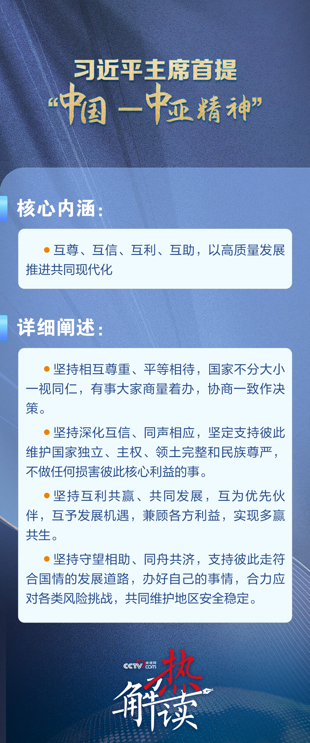 當(dāng)?shù)貢r(shí)間6月17日,習(xí)近平主席在哈薩克斯坦首都阿斯塔納出席第二屆中國(guó)—中亞峰會(huì)并作主旨發(fā)言,首次提出“中國(guó)—中亞精神”。