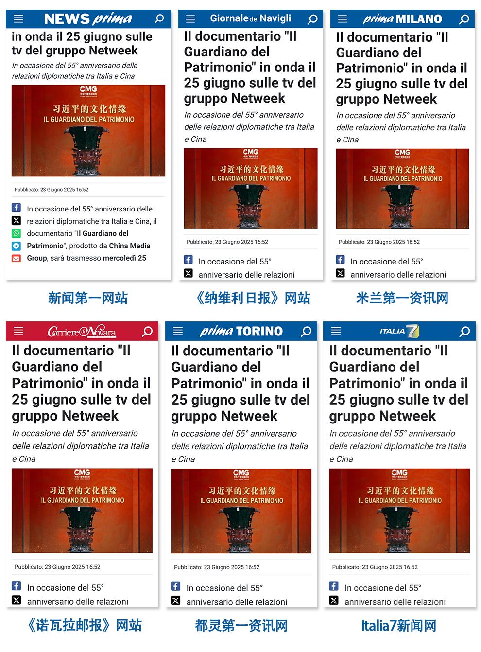 6月25日起,《習近平的文化情緣》在意大利阿爾瑪電視臺、多納電視臺、旅游電視臺、拉齊奧電視臺、倫巴第城市電視臺、羅馬科羅納廣播電視臺、米蘭帕維亞電視臺,《米蘭財經(jīng)報》網(wǎng)站等30多家意主流媒體平臺陸續(xù)上線播出。