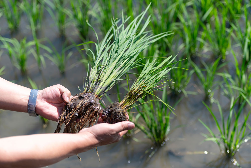 2025年6月18日,在黑龍江省雙鴨山市寶清縣一片水稻田旁,中國(guó)水稻研究所北方水稻研究中心科研人員查看應(yīng)用寒地水稻秸稈全量原位還田緩釋多效綜合技術(shù)的水稻(左)與普通水稻的長(zhǎng)勢(shì)差別。該技術(shù)能夠有效減少化肥用量、提升土壤有機(jī)質(zhì)含量,節(jié)約成本、提產(chǎn)增效。