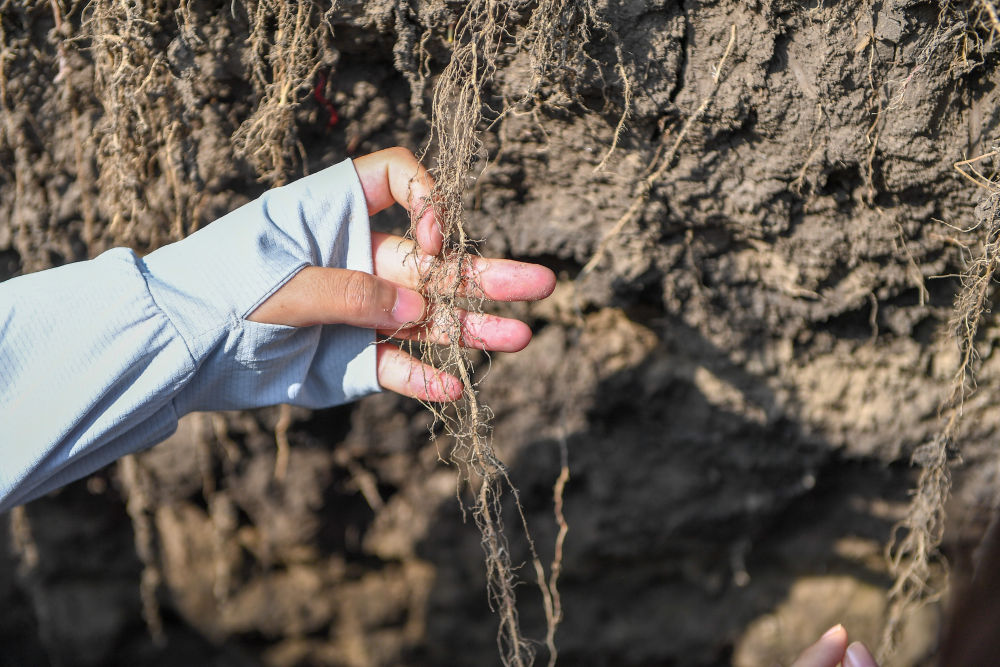2023年7月31日,在位于吉林省四平市梨樹縣的中國(guó)農(nóng)業(yè)大學(xué)“科技小院”保護(hù)性耕作試驗(yàn)田,一名學(xué)生查看玉米根部在黑土中的生長(zhǎng)情況。