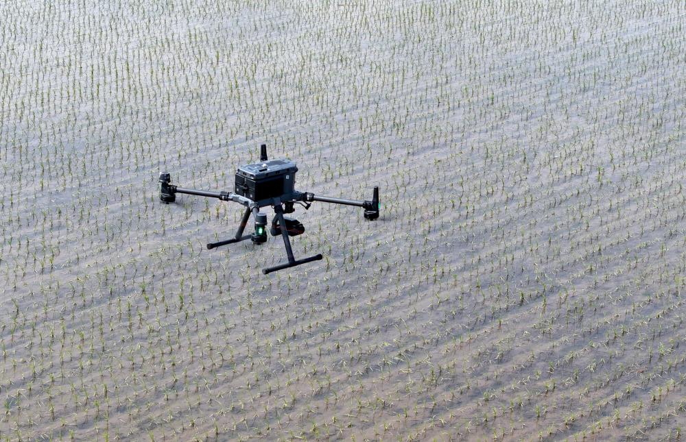 2025年5月21日,在黑龍江省北大荒農(nóng)業(yè)股份八五六分公司第六管理區(qū)農(nóng)業(yè)現(xiàn)代化示范區(qū),搭載多光譜、可見光攝像頭的無人機(jī)對(duì)水稻插秧后田塊進(jìn)行土壤墑情監(jiān)測(cè)(無人機(jī)照片)。