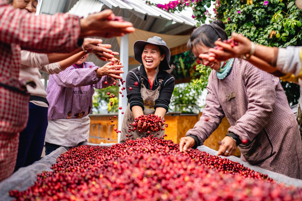 在云南省普洱市思茅區(qū)天玉咖啡莊園,莊園經(jīng)營(yíng)者玉噸(中)和工作人員慶祝咖啡豐收(2025年1月8日攝)。新華社記者 胡超 攝