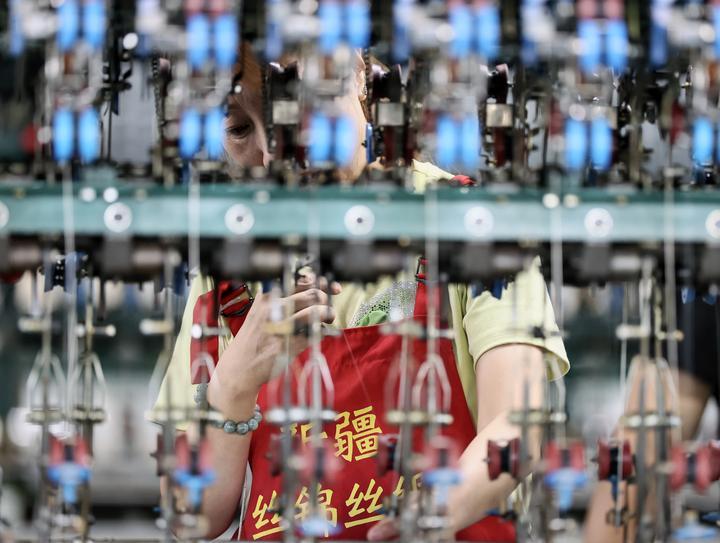 2025年7月29日,工人在新疆絲錦絲綢紡織有限公司生產(chǎn)車間內(nèi)的自動(dòng)繅絲機(jī)上作業(yè)。近年來,新疆塔城地區(qū)烏蘇市引進(jìn)桑蠶繭絲綢智能化全產(chǎn)業(yè)鏈項(xiàng)目,鼓勵(lì)農(nóng)民種桑養(yǎng)蠶,拓寬興邊富民新“絲”路。