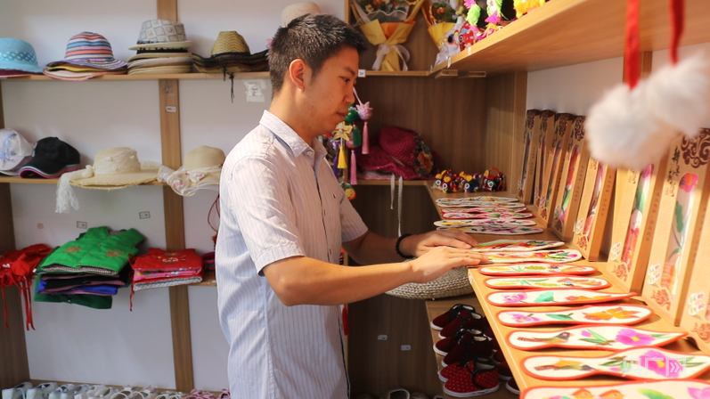 從外地返鄉(xiāng)的“90后”扶銀廷和妻子,在田鋪大塆創(chuàng)辦了一家“文創(chuàng)工坊”。“像鞋墊、虎頭枕、虎頭帽這些手工制品,都是我們當?shù)匾恍├先恕⒋蠼闶止ぷ龅?。這些特色的文創(chuàng)產(chǎn)品既能讓游客了解當?shù)乇就廖幕衷黾恿舜迕袷杖??!狈鲢y廷說。