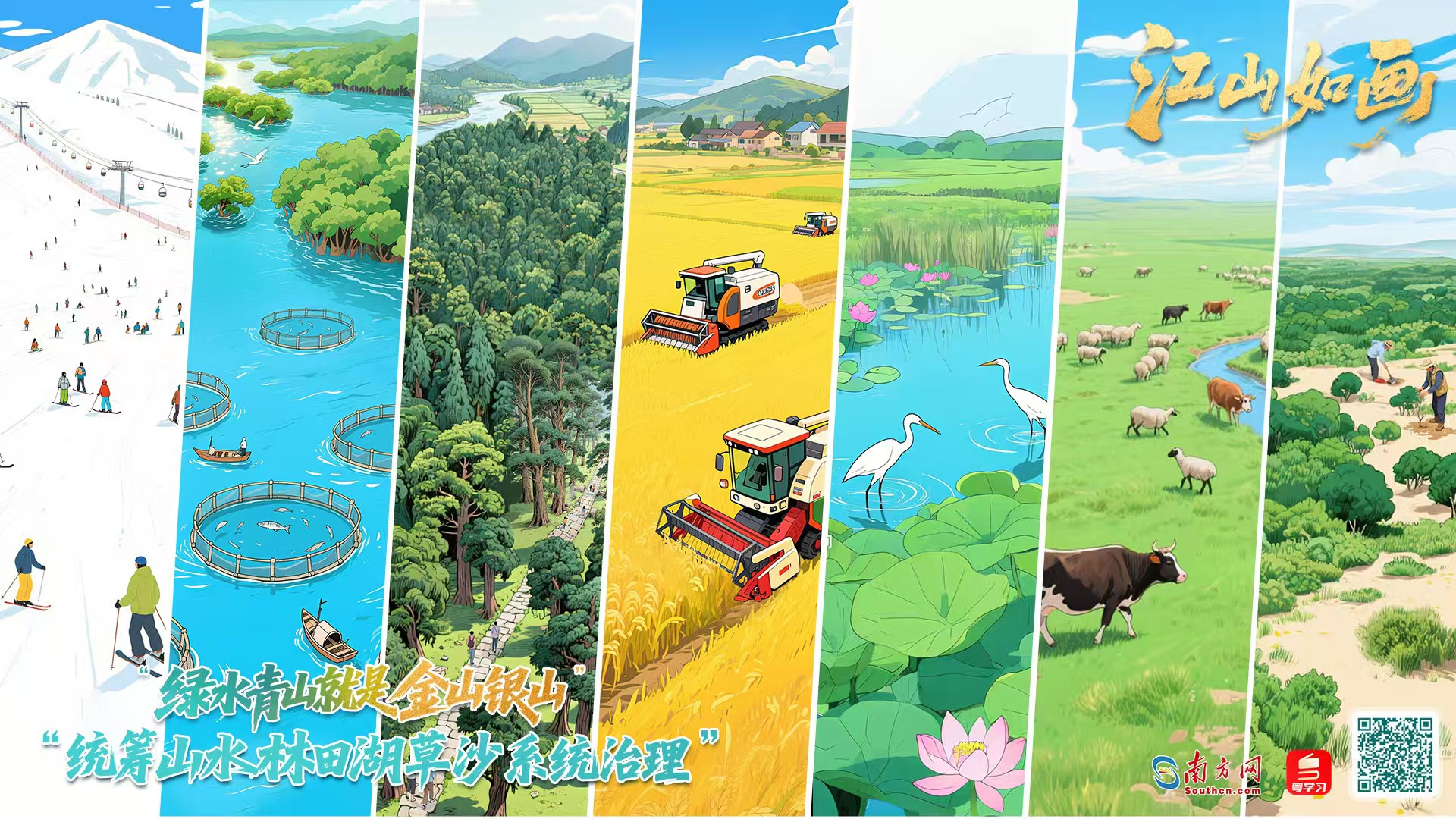 從20年前的余村到現(xiàn)在的中國(guó)大地,從“山水林田湖是一個(gè)生命共同體”到“統(tǒng)籌山水林田湖草沙系統(tǒng)治理”,從海拔0米的南海之濱到4000多米高的世界屋脊,幅員遼闊、高低起伏的中國(guó)大地上,綠色發(fā)展的藍(lán)圖漸次鋪展,美麗中國(guó)的畫(huà)卷逐筆繪就。