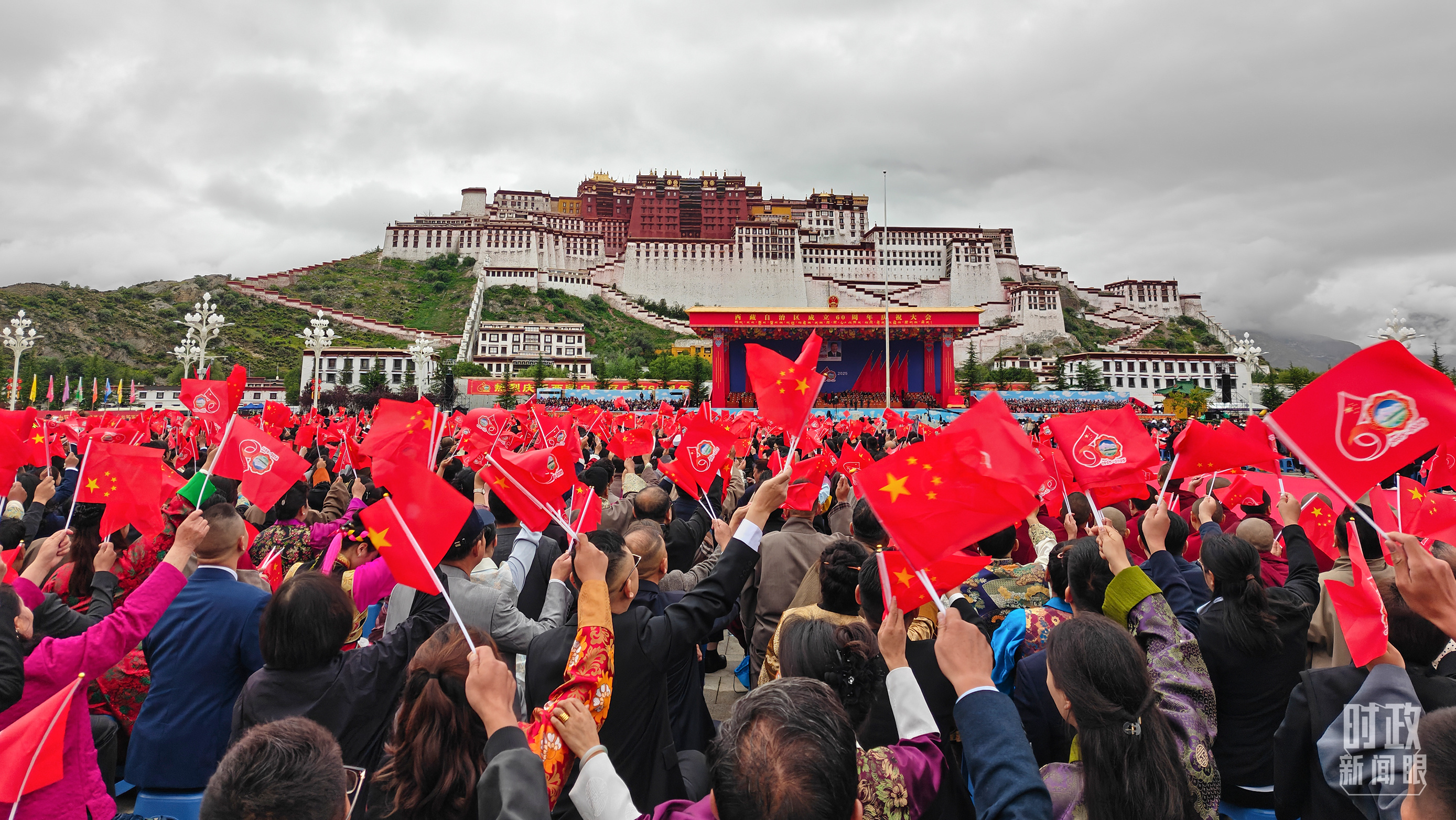 慶祝大會的會場設(shè)置在雄偉的布達拉宮前,位于群山環(huán)抱之中。大會主席臺采用藏式風格。約2萬人歡聚布達拉宮廣場,紅、黃、白、藍等體現(xiàn)藏族文化基因的色彩鋪滿眼前,烘托出吉祥喜慶的濃烈氛圍。