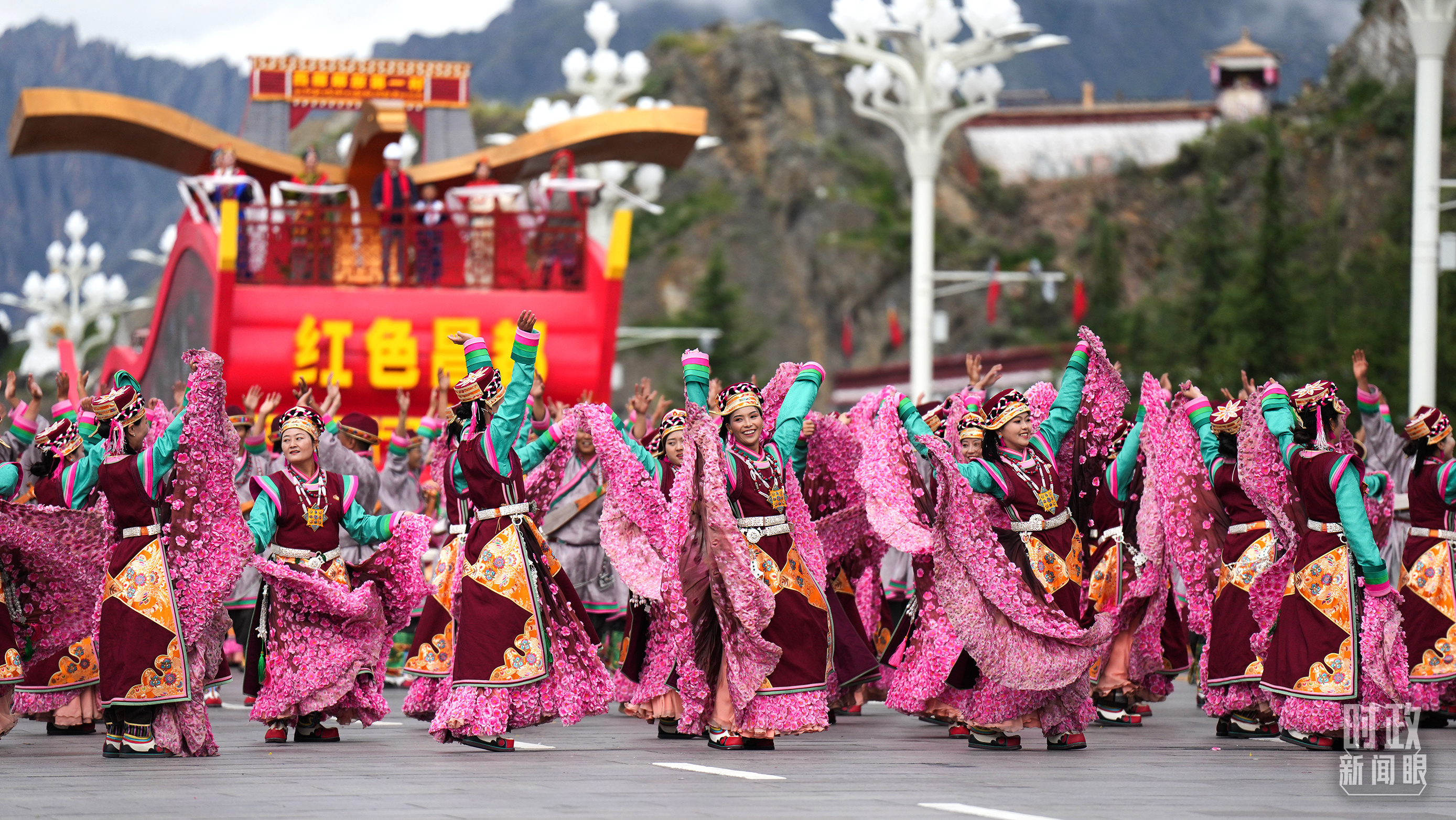 六十載櫛風沐雨,一甲子滄海桑田。格?;êH何柚校茡P的扎念琴聲響起,雄渾的甲諧舞、瓊結(jié)卓舞、弦子舞、鍋莊舞、普蘭宣舞應(yīng)接不暇,舞出西藏繁榮發(fā)展的精氣神。身穿工布服飾、飛天服飾等藏族特有服飾的游行群眾,以一場非物質(zhì)文化遺產(chǎn)的盛宴向西藏自治區(qū)成立60周年獻禮。