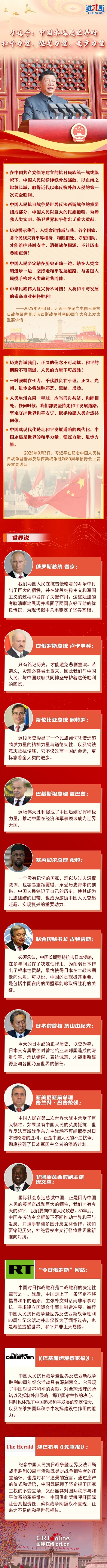 “中國永遠(yuǎn)是世界的和平力量、穩(wěn)定力量、進(jìn)步力量?!睆膭?chuàng)建聯(lián)合國到提出和平共處五項原則,再到推動構(gòu)建人類命運共同體,中國始終面向光明,做世界和平與安全的堅定維護(hù)者。國際社會高度評價中國為世界反法西斯戰(zhàn)爭勝利作出的巨大貢獻(xiàn),認(rèn)為抗戰(zhàn)不僅改寫中國的命運,更標(biāo)志著全人類的進(jìn)步;戰(zhàn)后的中國走上了一條堅定不移倡導(dǎo)和平發(fā)展的道路,并以此次紀(jì)念活動為契機(jī),呼吁國際社會共擔(dān)責(zé)任,確保戰(zhàn)爭陰霾永不重現(xiàn),讓來之不易的和平世代相傳。