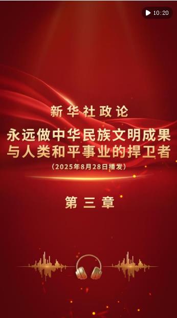 新華社8月28日播發(fā)《新華社政論|永遠(yuǎn)做中華民族文明成果與人類和平事業(yè)的捍衛(wèi)者——寫在中國人民抗日戰(zhàn)爭暨世界反法西斯戰(zhàn)爭勝利80周年之際》。我們邀請(qǐng)誦讀嘉賓吳樾演播“第三章”。