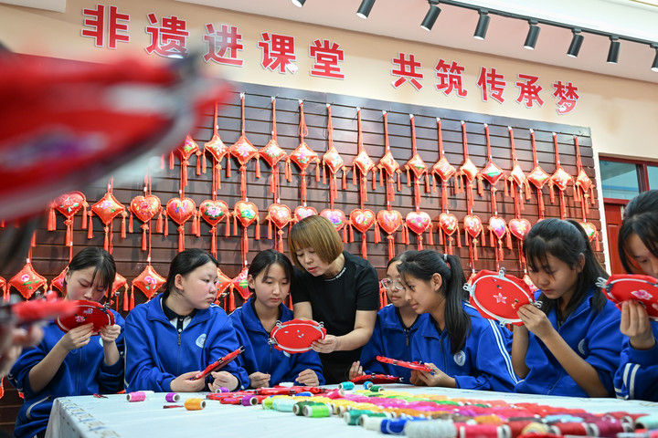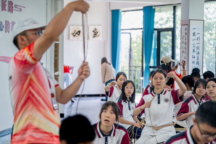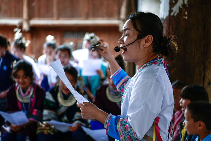 2025年9月26日,內蒙古興安盟科右中旗巴彥呼舒第六中學美術教師、非遺代表性傳承人吳斯琴(左四)指導學生刺繡。近年來,內蒙古興安盟科爾沁右翼中旗巴彥呼舒第六中學將當?shù)貒壹壏沁z圖什業(yè)圖刺繡引入校園,開設校本課程,并成立興趣社團,在豐富校園文化生活的同時,讓學生們近距離感受非遺的魅力,弘揚和傳承中華優(yōu)秀傳統(tǒng)文化。隨著國產動畫電影《哪吒之魔童鬧?!凡粩嗨⑿轮袊笆菲狈考o錄,參與電影配樂的貴州省榕江縣三寶侗寨的楊想妮和“舞樂蟬歌”團隊為更多人所熟知。樂團成員懷揣“用音樂傳遞侗族文化,讓世界聽見侗族大歌”的共同夢想,將侗族大歌推向更廣闊的舞臺。這是2025年4月22日,楊想妮在貴州省黎平縣肇興鎮(zhèn)廈格侗寨教前來研學的孩子們唱侗歌。