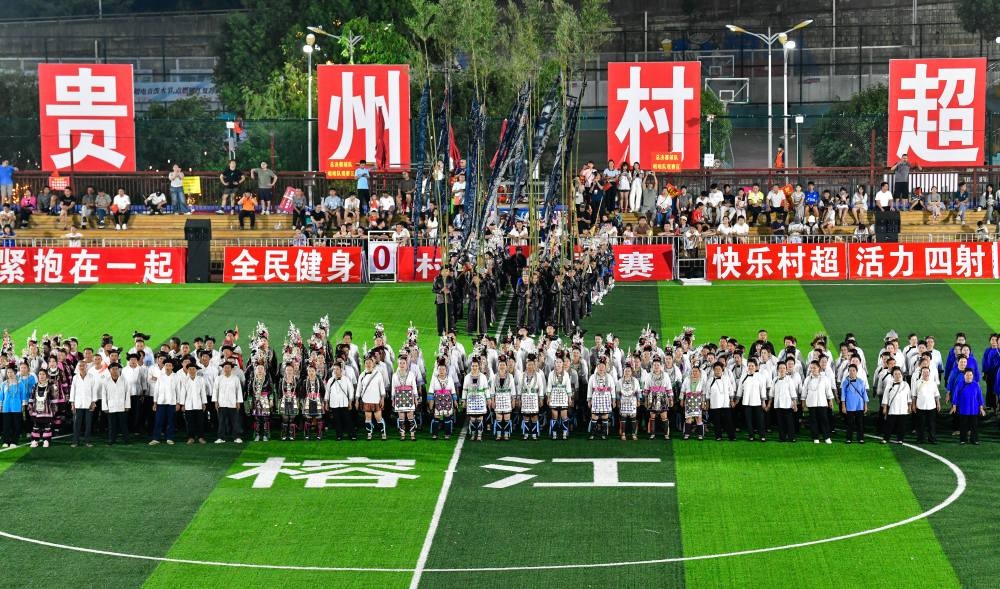 2025年8月23日,村民們?cè)谫F州“村超”球場演唱侗族大歌。當(dāng)日,2025年首屆“村超”全國賽總決賽在貴州榕江縣“村超”球場舉行。賽事期間同時(shí)舉辦豐富多彩的民族歌舞展演、無人機(jī)表演、大型煙花秀,吸引數(shù)萬觀眾現(xiàn)場觀賽。近年來,貴州“村超”“村BA”等草根賽事持續(xù)升溫,巧妙融合體育競技、民族文化與文旅消費(fèi),打造“體育+”模式,撬動(dòng)鄉(xiāng)村流量與經(jīng)濟(jì)增量,賦能鄉(xiāng)村振興。
