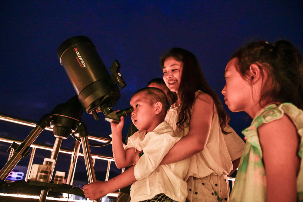 2025年7月9日,游客在貴州省平塘縣克度“天文小鎮(zhèn)”通過望遠(yuǎn)鏡觀測星空。近年來,隨著旅游設(shè)施逐漸完善,距離“中國天眼”僅8公里的克度“天文小鎮(zhèn)”通過“科普+文旅”發(fā)展模式,帶動(dòng)村民就業(yè)創(chuàng)業(yè)、增收致富。2025年1月至6月,“中國天眼”景區(qū)共接待游客約38萬人次,總收入2496萬余元。