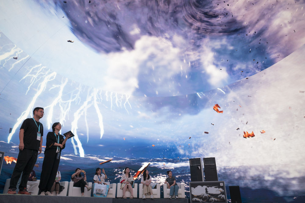 2024年7月22日,游客在“尋境敦煌——數(shù)字敦煌沉浸展”借助VR設(shè)備沉浸式游覽莫高窟第285窟虛擬場景?!皩ぞ扯鼗汀獢?shù)字敦煌沉浸展”綜合運(yùn)用VR虛擬現(xiàn)實(shí)、三維建模、游戲引擎的物理渲染和全局動(dòng)態(tài)光照等新技術(shù),高精度立體還原了莫高窟第285窟。游客戴上VR眼鏡,不僅可以零距離觀賞壁畫、360度自由探索洞窟細(xì)節(jié),還能“飛升”到窟頂,身臨其境參與壁畫故事情節(jié),沉浸式感受敦煌文化的魅力。