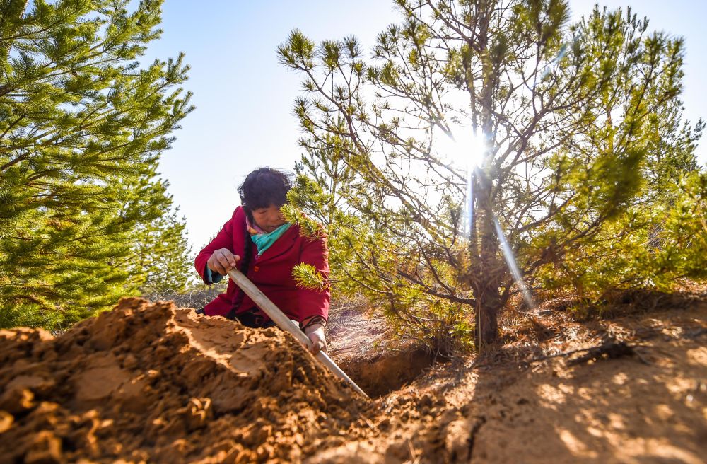 2021年3月23日,殷玉珍在內(nèi)蒙古毛烏素沙漠挖土,查看松樹根部的生長情況。20世紀(jì)80年代,殷玉珍嫁到這片沙地時,眼前只有漫無邊際的黃沙。1986年,她埋下第一棵樹苗,從此與風(fēng)沙較勁。如今,7萬多畝荒沙披上了綠裝,治理好的土地上種起了小米,金燦燦的谷穗成了“沙漠黃金”。