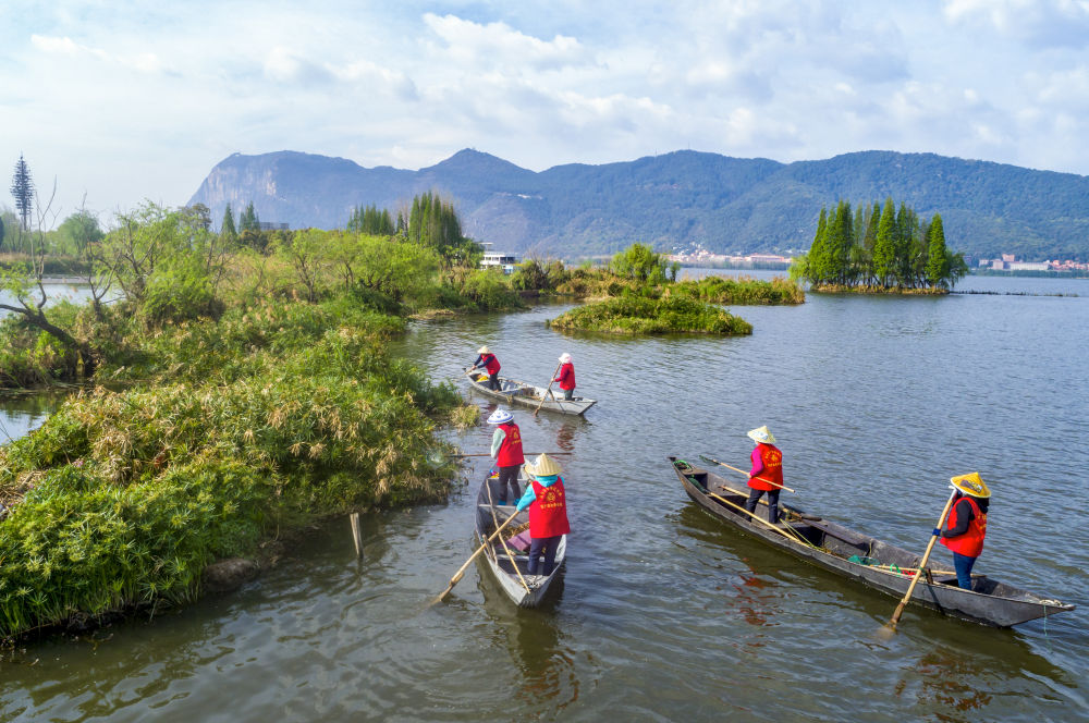 2023年3月20日,巾幗打撈隊隊員在云南昆明滇池草海打撈水草(無人機照片)。在云南昆明滇池邊,活躍著一支由當(dāng)?shù)貗D女組成的巾幗打撈隊。數(shù)十年來,她們駕駛船只打撈滇池及周邊入湖河道、濕地的垃圾、雜草等。