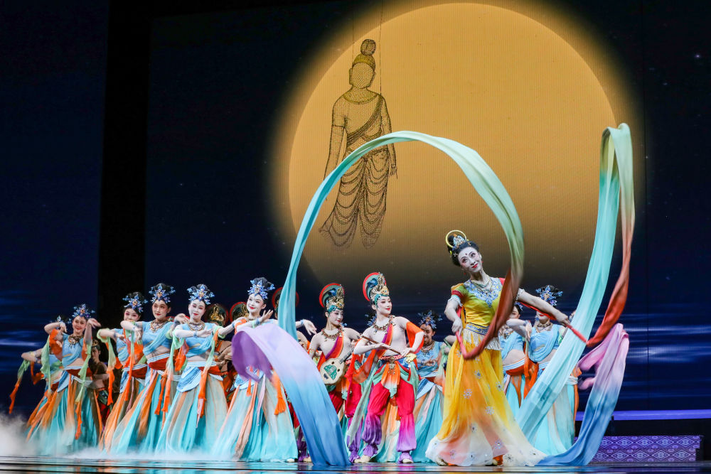 2025年9月22日,在敦煌舉辦的“相約敦煌”國際文化交流演出活動上,甘肅省演藝集團的演員展演《樂動敦煌》選段。《樂動敦煌》借助對莫高窟壁畫、藏經(jīng)洞古籍的解讀梳理,活化敦煌古樂器、古樂譜研發(fā)成果,通過全息投影等手段,結合專業(yè)演員的表演,將莫高窟壁畫中的樂舞盛景生動再現(xiàn),讓觀眾沉浸式感悟傳承千年的敦煌樂舞文化魅力。