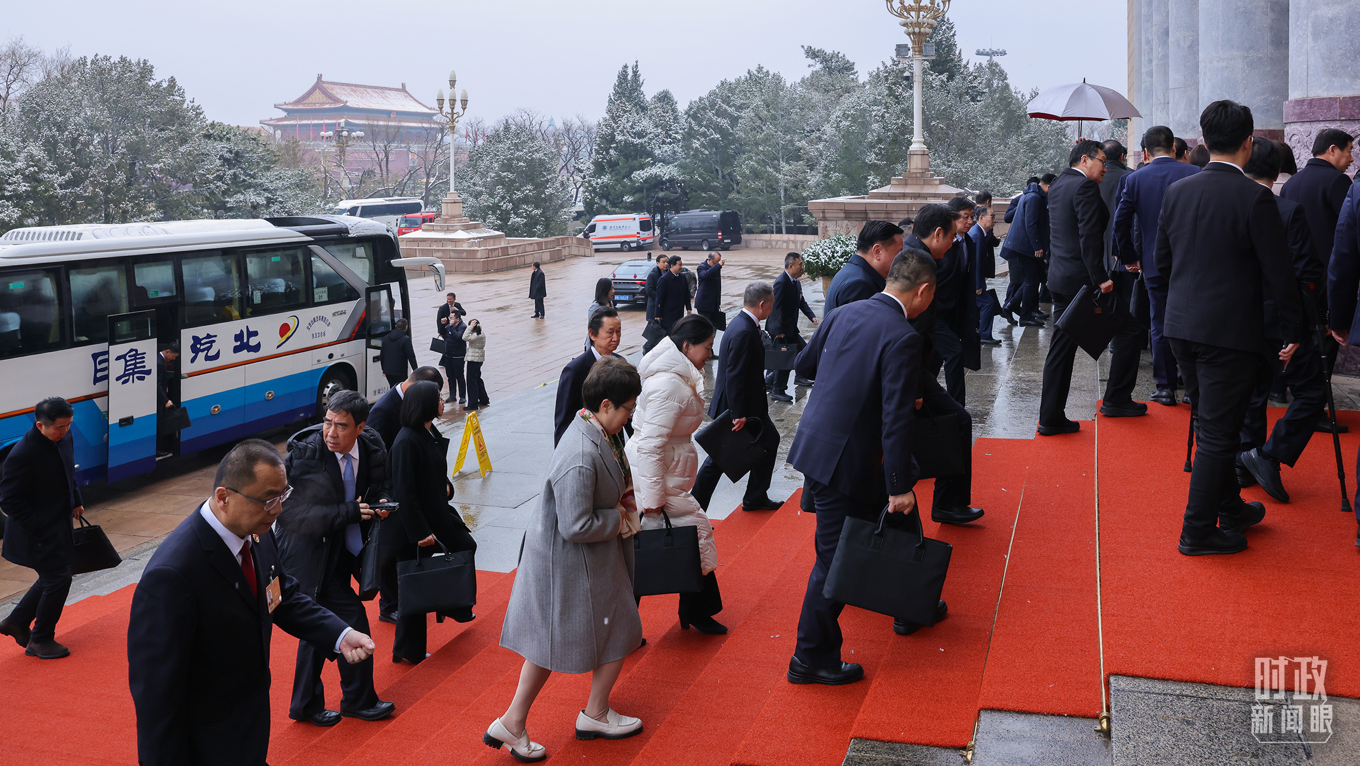 江蘇代表團乘車前往人民大會堂。(總臺記者黃成拍攝)