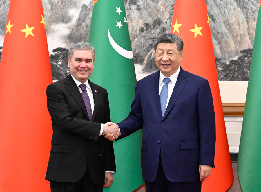 3月18日下午,國家主席習(xí)近平在北京釣魚臺國賓館會見來華進行友好訪問的土庫曼斯坦民族領(lǐng)袖、人民委員會主席別爾德穆哈梅多夫。新華社記者 翟健嵐 攝