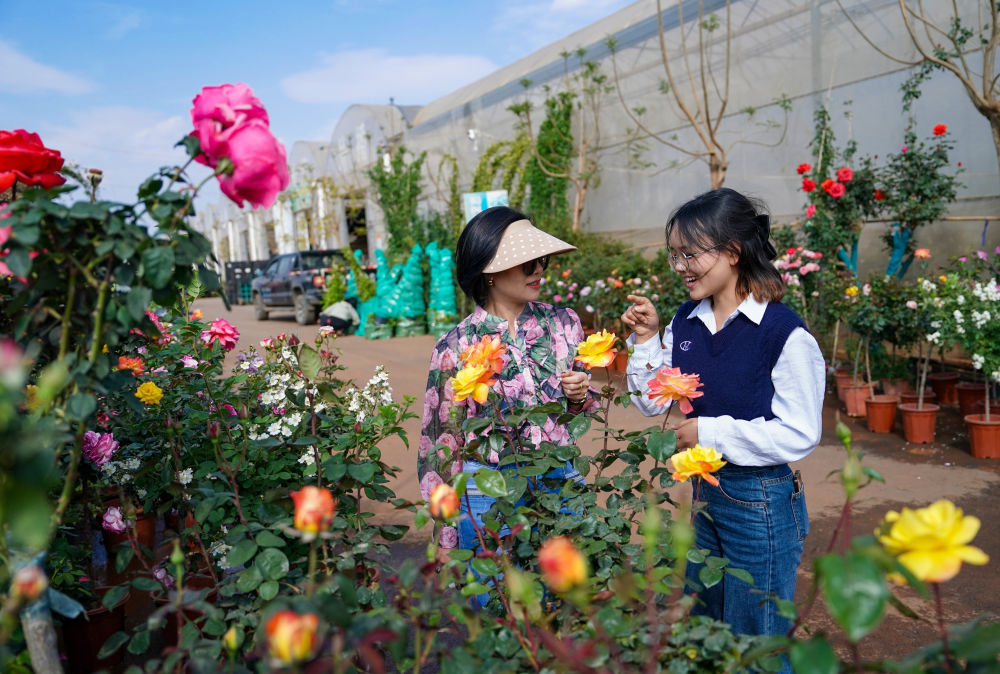 2025年4月11日,越南花商阮翠云(左)與翻譯李青歌在云南昆明斗南一花卉基地內(nèi)查看鮮花品質(zhì)。2018年,阮翠云開始在越南銷售云南花卉,讓七彩“云花”成為眾多越南家庭的“常客”。借助高效的電商平臺和快捷的物流網(wǎng)絡(luò),鮮花從云南花田到河內(nèi)貨架實現(xiàn)了“次日達”。