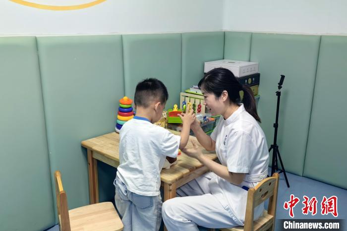 6月6日,在南昌大學(xué)第一附屬醫(yī)院贛江新區(qū)醫(yī)院,醫(yī)護(hù)人員為孤獨(dú)癥兒童提供康復(fù)幫扶。江西省殘疾人福利基金會(huì) 供圖