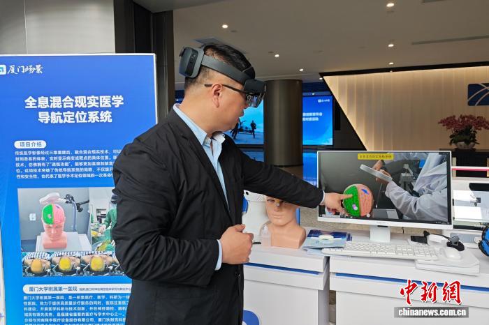 3月26日,廈門場景創(chuàng)新發(fā)布會暨供需對接活動舉辦。圖為廈門大學附屬第一醫(yī)院卒中中心主任陳四方向參會者介紹該醫(yī)院的“全息混合現(xiàn)實醫(yī)學導航定位系統(tǒng)”?!枪跇?攝