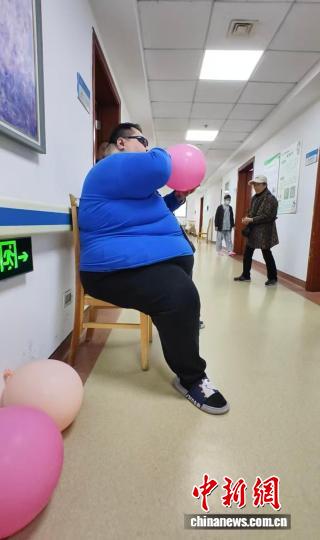術(shù)前,周先生吹氣球鍛煉肺功能。(受訪者楊建軍供圖)