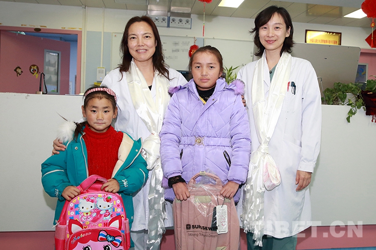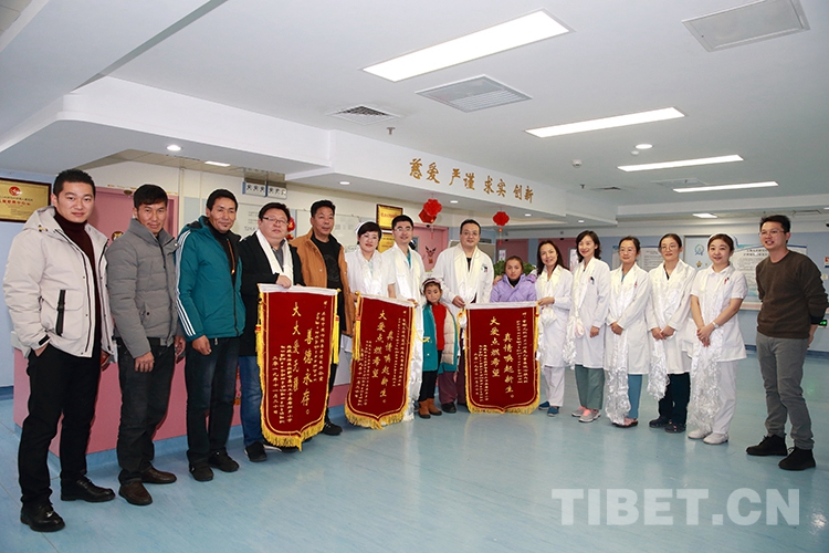 返鄉(xiāng)前,洛桑曲宗和次旦德吉在親屬和小學校長的帶領(lǐng)下來到兒研所,向醫(yī)護人員和共鑄中國心組委會的工作人員獻上了哈達和錦旗,表達感激之情。醫(yī)護人員也向兩個孩子贈送了書包等文具,鼓勵他們回校后好好學習。
