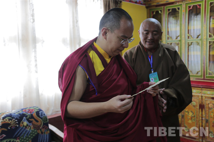 圖為十一世班禪在學(xué)術(shù)講座廳翻閱學(xué)員筆記 攝影:王淑
