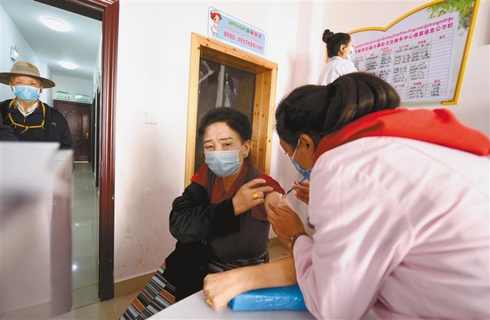 圖為10月27日,在拉薩市城關(guān)區(qū)吉崩崗街道辦事處衛(wèi)生服務(wù)中心,醫(yī)務(wù)人員在給老年人接種流感疫苗。記者 洛桑 潘多 攝