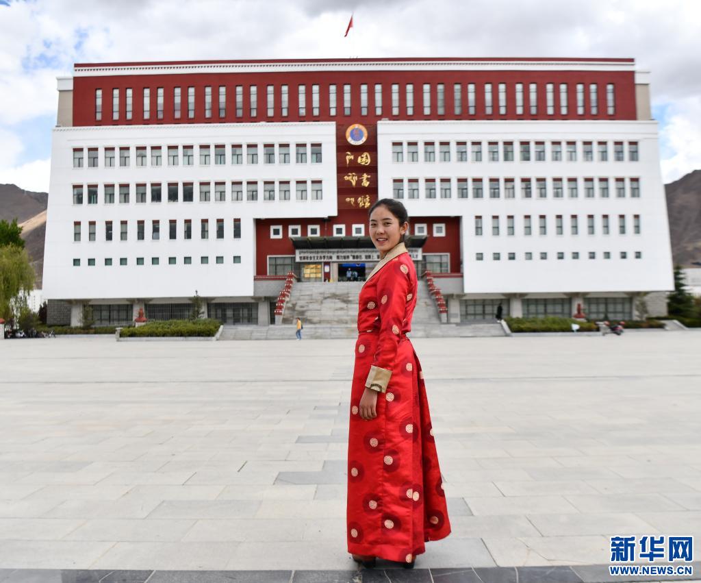 拉增在西藏大學(xué)圖書(shū)館前留影(5月7日攝)。新華社記者 晉美多吉 攝