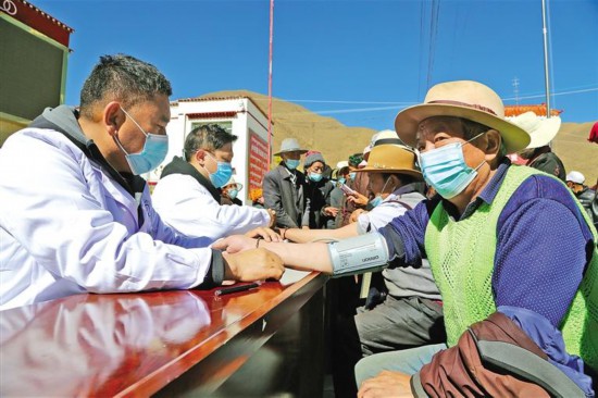圖為志愿者為當(dāng)?shù)厝罕姕y量血壓。通訊員 倫珠次仁 記者 潘多 攝