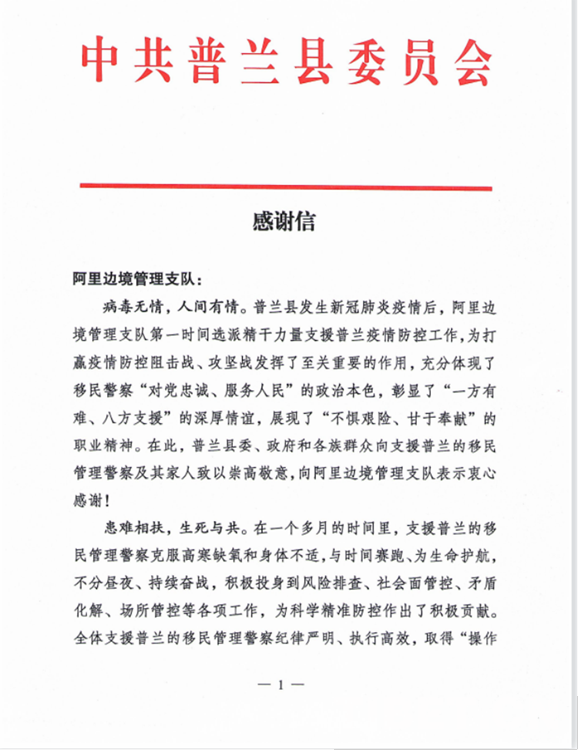 中國西藏網(wǎng)訊 “普蘭縣發(fā)生新冠肺炎疫情后,阿里邊境管理支隊第一時間選派精干力量支援普蘭疫情防控工作,為打贏疫情防控阻擊戰(zhàn)、攻堅戰(zhàn)發(fā)揮了至關重要的作用?!?0月2日,西藏自治區(qū)阿里邊境管理支隊收到一封來自阿里地區(qū)普蘭縣委的感謝信。信中對阿里邊境管理支隊戰(zhàn)“疫”一線民警在一個多月的疫情防控工作中,克服困難、勇于擔當、不分晝夜、持續(xù)奮戰(zhàn)的抗疫工作表達了感謝,給予了肯定。