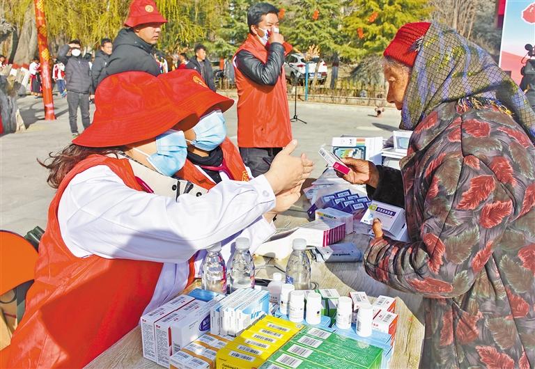 圖為自治區(qū)衛(wèi)生健康系統(tǒng)的志愿者在瓊結(jié)縣為群眾贈(zèng)藥、解答健康問題。記者 劉楓 攝