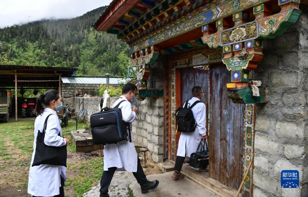 6月12日上午10點(diǎn),廣東珠海市人民醫(yī)院第七批援藏醫(yī)療隊(duì)隊(duì)長王振疆、隊(duì)員陳冰、王彤旭和年輕的當(dāng)?shù)蒯t(yī)生尼瑪益西一起帶著醫(yī)療設(shè)備和藥品,離開西藏米林市人民醫(yī)院,驅(qū)車前往30多公里外的吞不絨村為患者進(jìn)行診療。