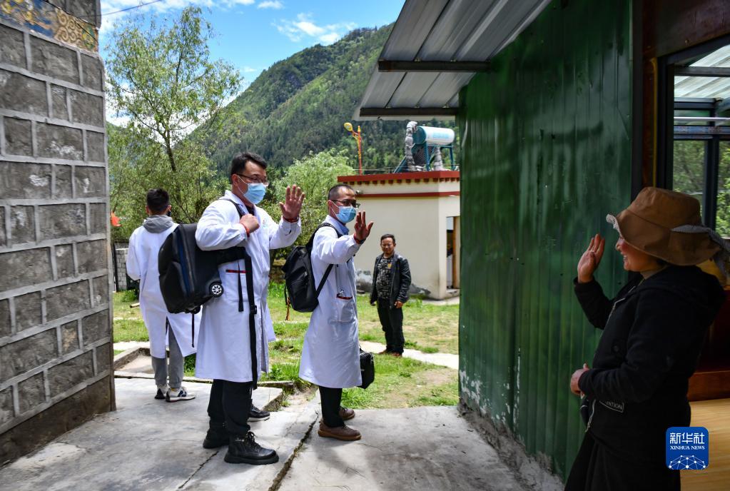 6月12日,王振疆醫(yī)生一行離開時(shí),病人阿珍的女兒(右)和他們揮手告別。新華社記者 晉美多吉 攝