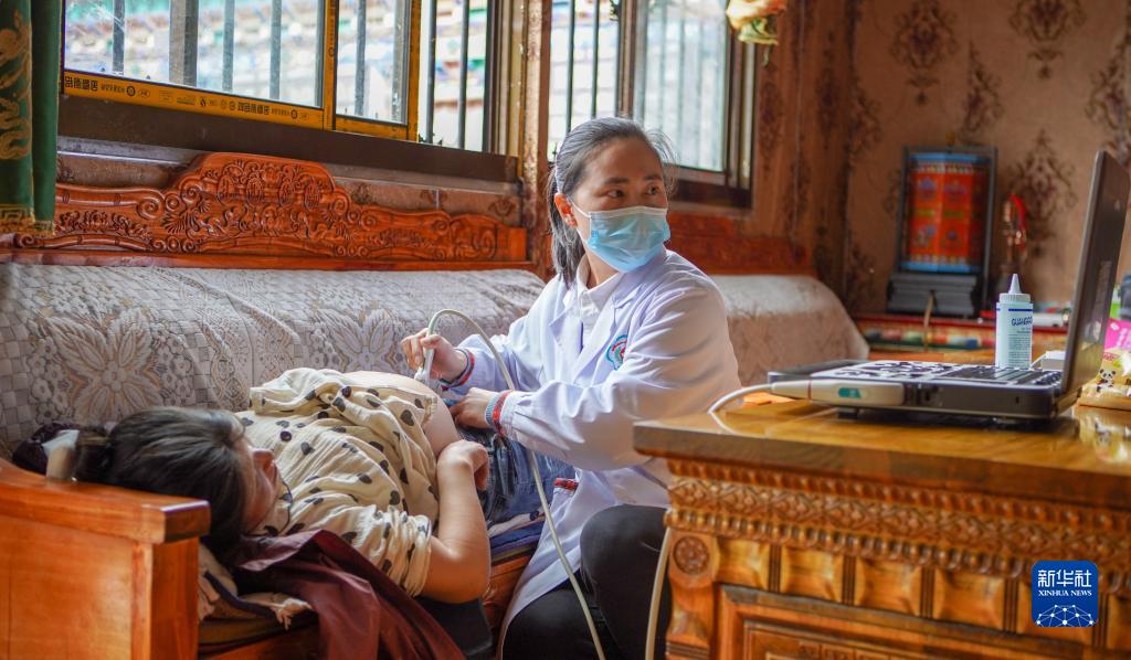 6月12日,王旭彤醫(yī)生在給珠杰檢查身體。新華社記者 晉美多吉 攝