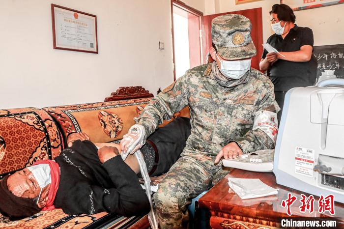 “能不能去家里給我阿媽檢查一下呢?”在巡診現(xiàn)場,醫(yī)療隊隊長賀焱林得知70歲的藏族老阿媽格桑措姆,因身體原因無法到達現(xiàn)場就醫(yī)后,立即派出內(nèi)外科黃秋儒、馬善金2名經(jīng)驗豐富的軍醫(yī)冒雨前往老人家中進行救治。