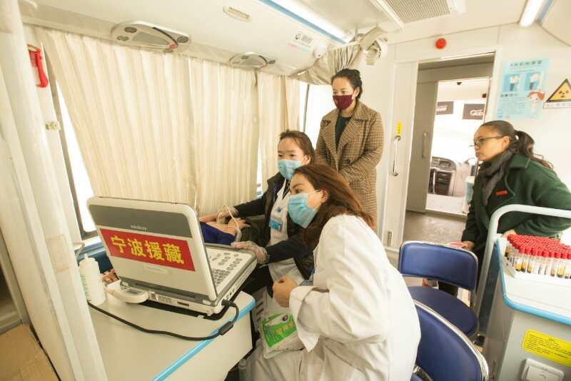 一輛八米多長(zhǎng)的農(nóng)牧民健康體檢車按照年度計(jì)劃,穿梭于比如縣的大小鄉(xiāng)村。車上載有先進(jìn)的DR(數(shù)字影像攝片機(jī))、便攜彩超機(jī)、心電圖機(jī)、便攜檢驗(yàn)設(shè)備。這臺(tái)車是浙江省援藏副指揮長(zhǎng)、比如縣委常務(wù)副書(shū)記盛悠聯(lián)系寧波市江北區(qū)政府捐贈(zèng)的。在第八批寧波紹興援藏工作組干部的精心設(shè)計(jì)下,專門向宇通公司定制的一輛功能齊全的大巴體檢車,光車底和改裝費(fèi)用就達(dá)73萬(wàn)元。它與普通體檢車需要接入停泊地市電、自來(lái)水才能運(yùn)行不同,寧波的援藏干部根據(jù)西藏鄉(xiāng)村缺電少水的現(xiàn)狀,多方咨詢方案,最后增加了價(jià)值十萬(wàn)元的高壓電容設(shè)備,實(shí)現(xiàn)了通過(guò)車載的小型發(fā)電機(jī)帶動(dòng)50千瓦的DR,并可連續(xù)運(yùn)轉(zhuǎn),這在全國(guó)尚屬首例。車上還配備主動(dòng)式抽水泵,解決上水問(wèn)題,并配有空調(diào)系統(tǒng)。車子開(kāi)到哪里,便可不靠外力,進(jìn)行包括拍攝X光片、彩超、心電、檢驗(yàn)等的全面健康體檢,許多鄉(xiāng)鎮(zhèn)衛(wèi)生院也不如這輛體檢車的配置強(qiáng)大。