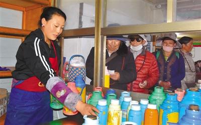 沖賽康“愛心飯館”位于拉薩老城區(qū)核心地帶,因“愛心飯館”飯菜量足、甜茶味道好,深受廣大居民群眾的喜愛。記者來到?jīng)_賽康“愛心飯館”時,飯館內(nèi)早已座無虛席,每個窗口前都排滿了人,廚房內(nèi)的工作人員更是忙得不可開交?!疤鸩枰呀?jīng)賣完了,請稍等一會兒,我們馬上做?!狈?wù)員向客人說道。