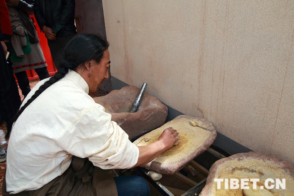 圖為貢桑曲登正在研磨藥材。攝影:陳衛(wèi)國(guó)