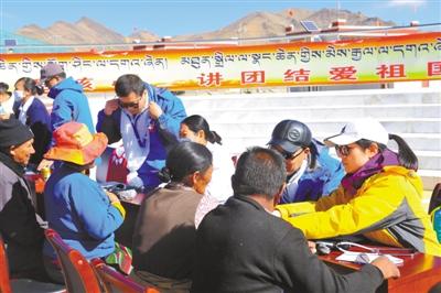 圖為阿里地區(qū)醫(yī)療人才組團(tuán)式援藏工作隊的專家們正在為日土縣日松鄉(xiāng)甲崗村群眾義診。溫凱 攝